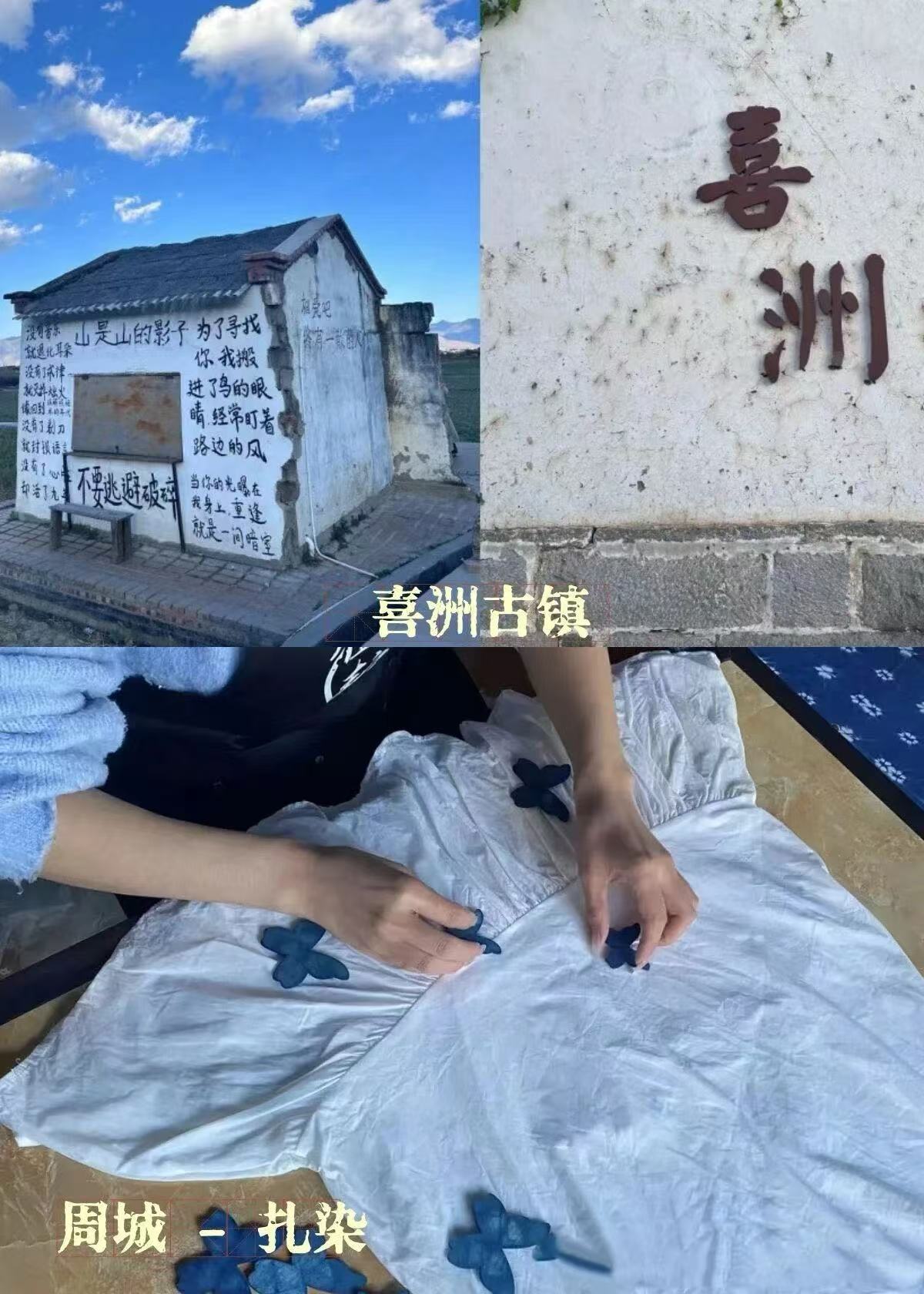 下午:喜歡騎行的可騎車去喜洲古鎮(zhèn),但有一定距離,也可自駕去喜洲古鎮(zhèn)。(?附近的打卡點夫妻樹看點一般,沒時間的可不去)。有時間可以前往周城扎染村,體驗白族扎染文化。